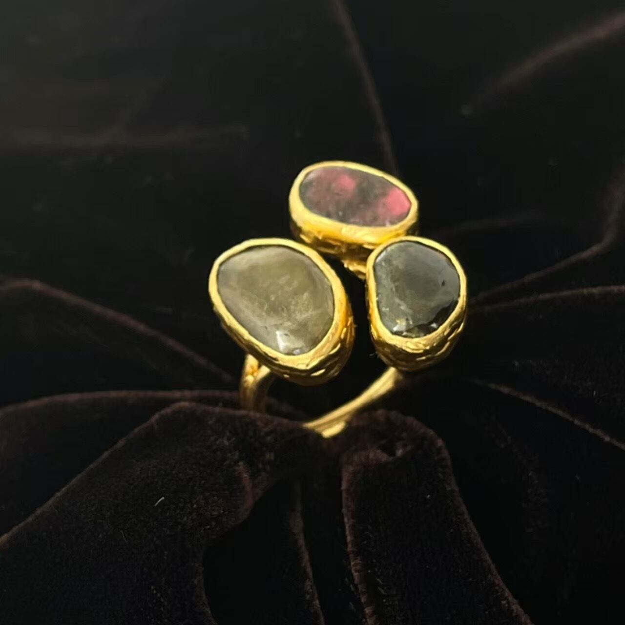 ブラック、グリーン、レッドの3色のトルマリンを大きく配置した存在感のあるリングです